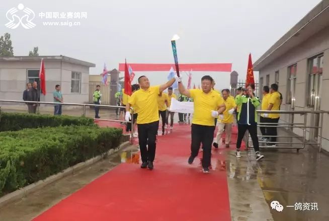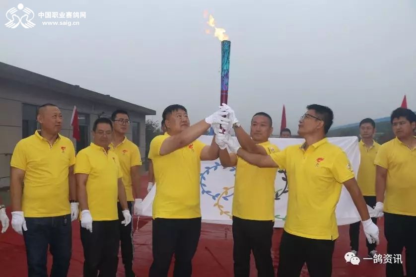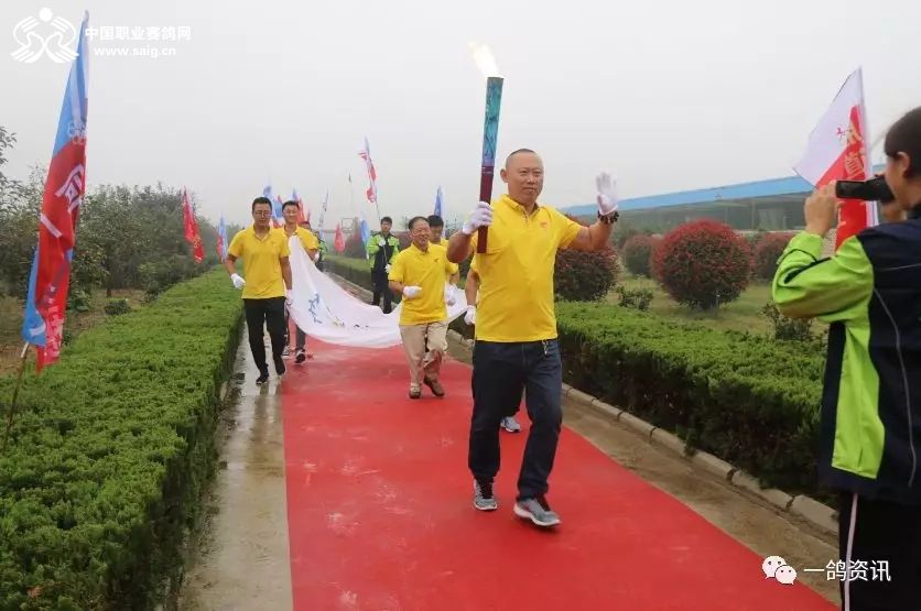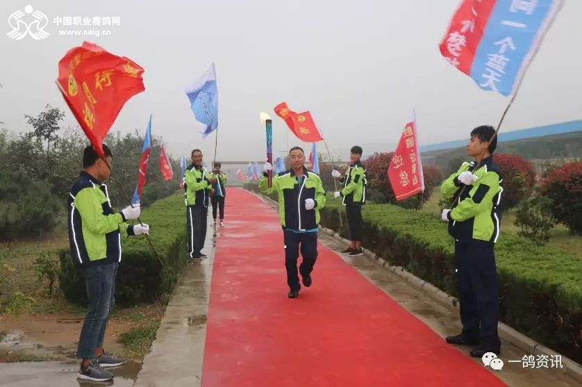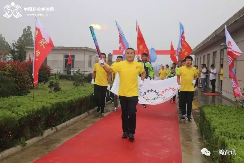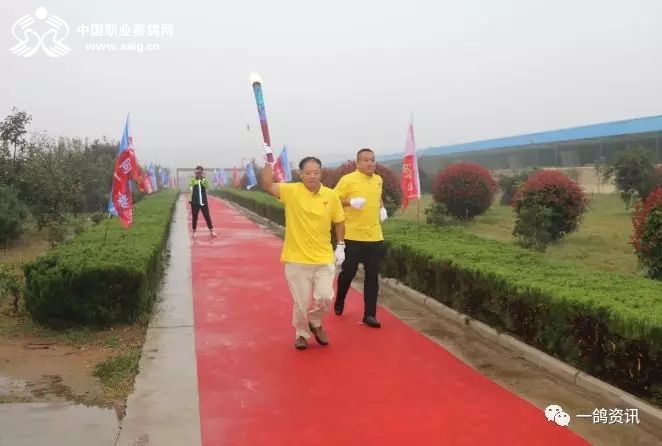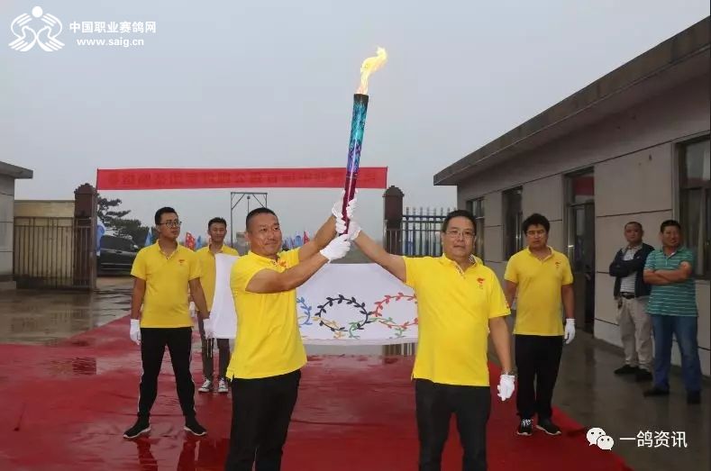 踏着红地毯,中国职业赛鸽网CEO申延峰手托圣火火种,西安爱丽丝畜牧有限公司总经理王新萍手握圣火火炬,在鸽坛奥运五环旗的跟随下,庄重地走进公棚,同化书岭董事长、程向东主席共同点燃了火炬。