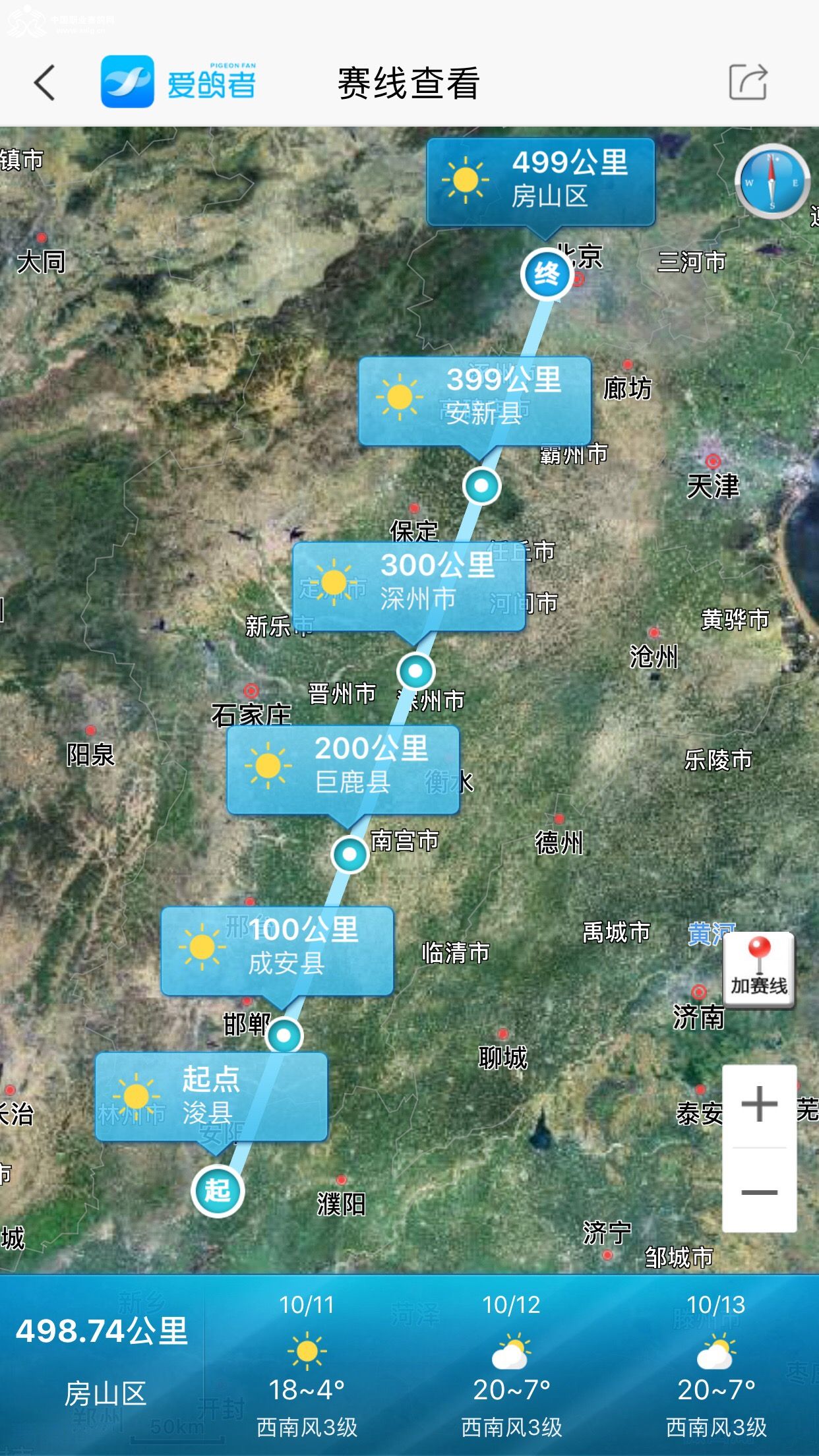 2018年中国杯“铁鹰四关”1千元专环和3千元专环第一关500公里比赛10月11日早上07:08于河南淇县同时开笼,放飞地坐标为东经114°19′26.72〃,北纬35°36′08.04〃。比赛共计放飞10885羽参赛鸽,其中三千元组178舍、7360羽,千元组154舍、3525羽。