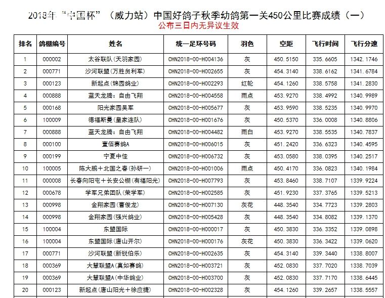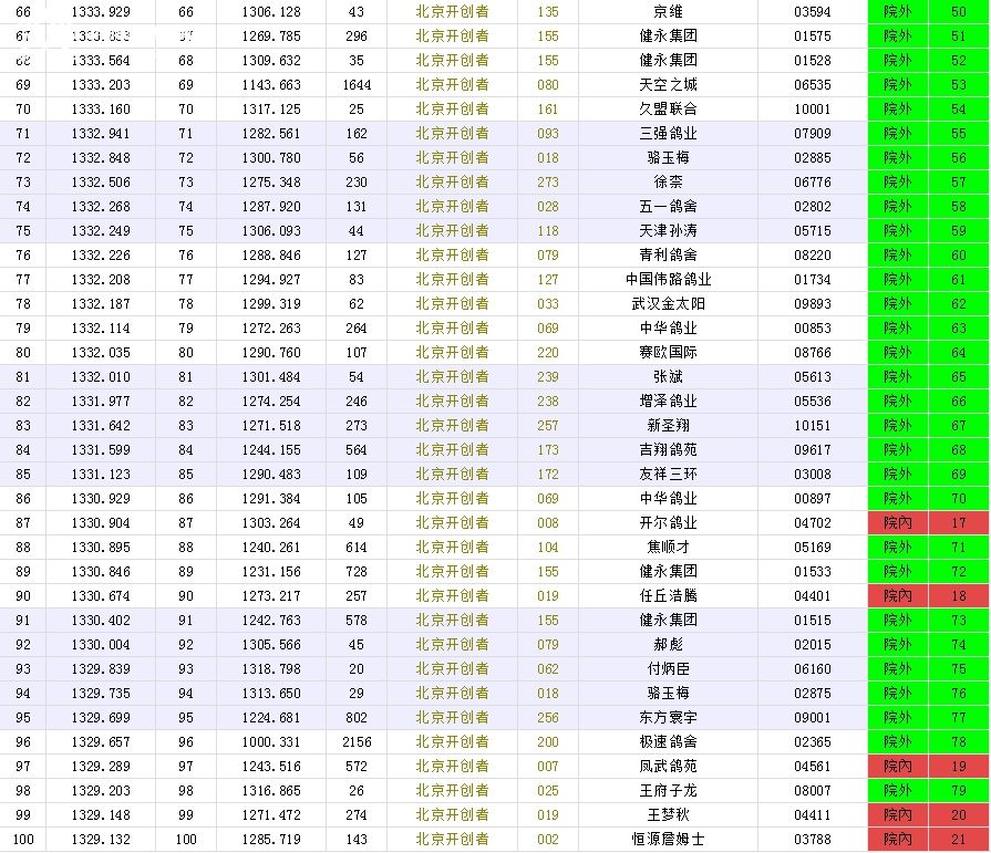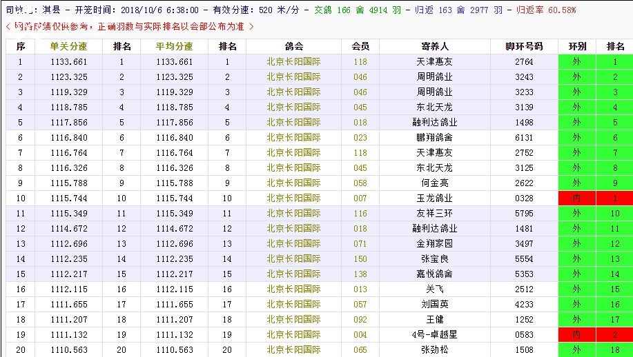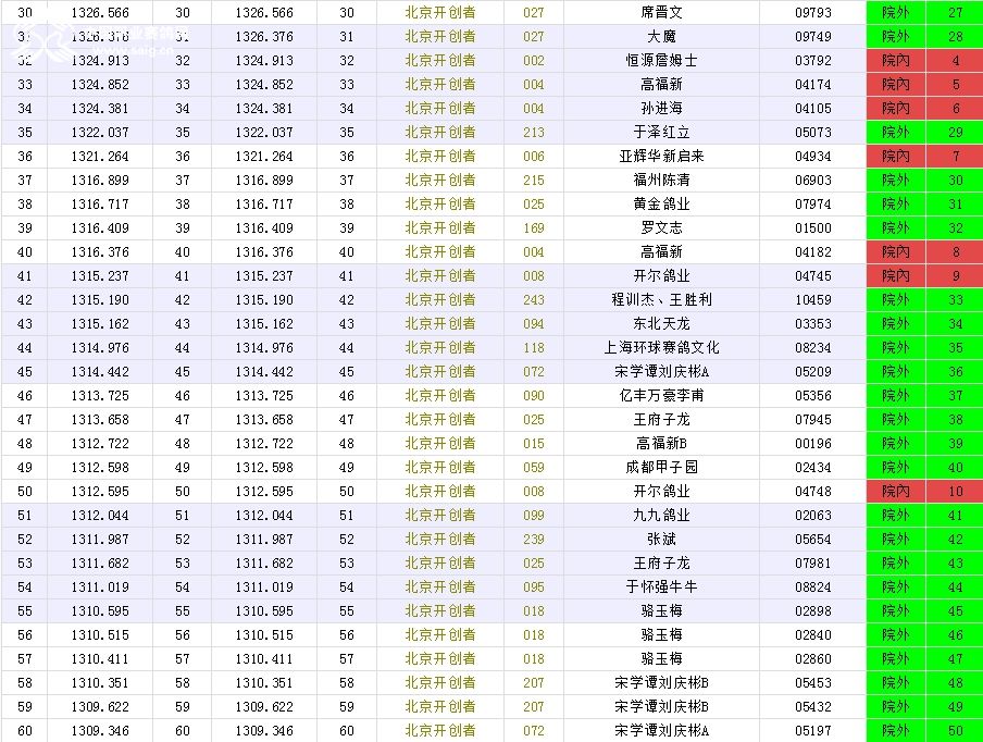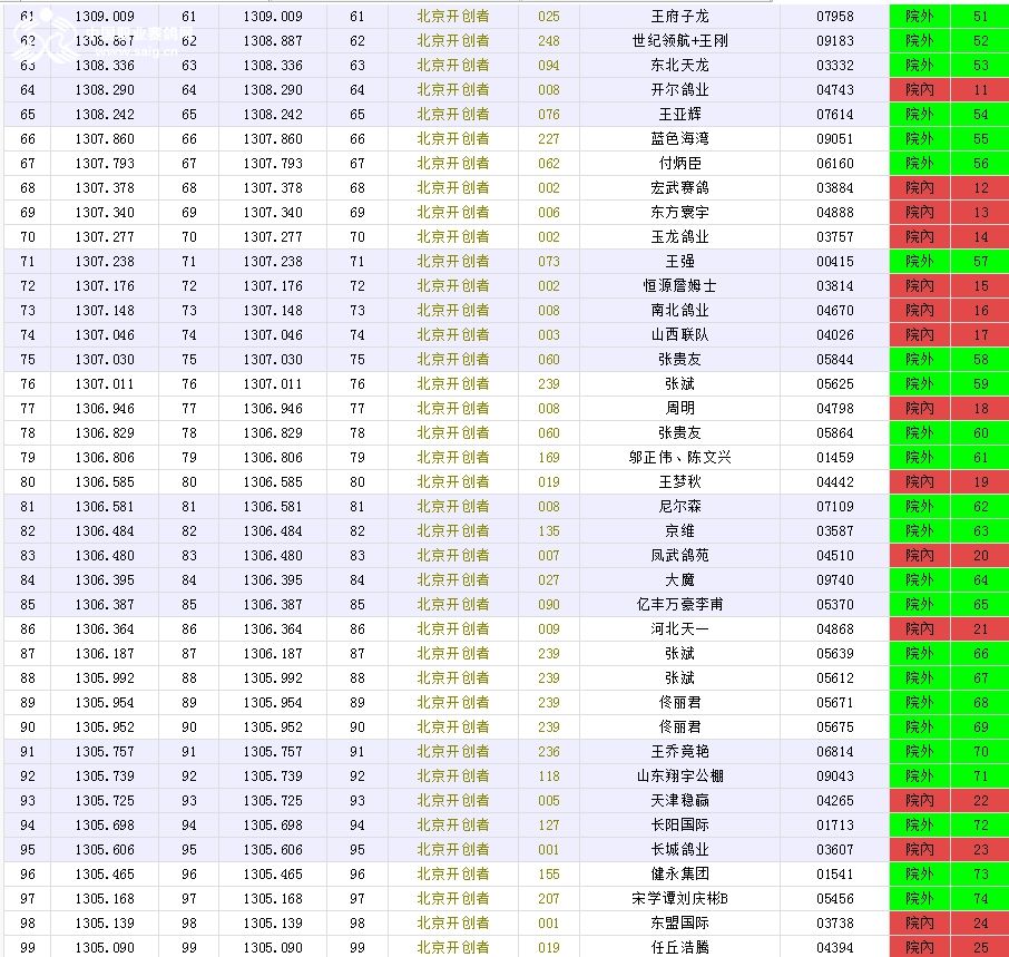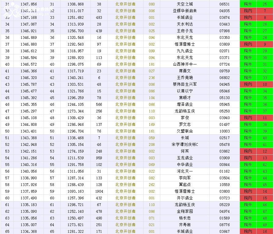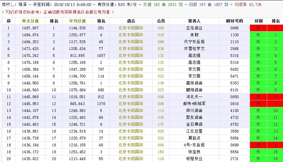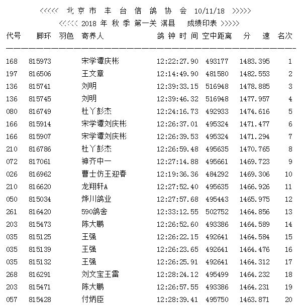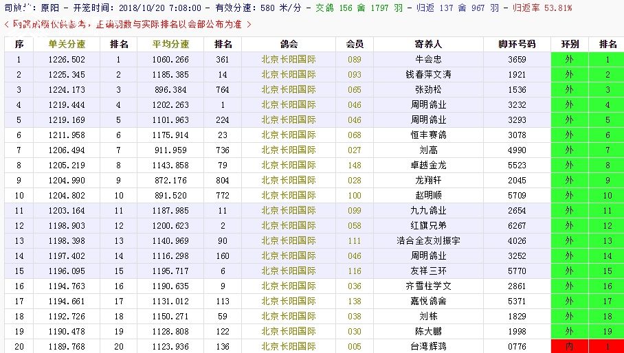 北京长阳国际赛鸽俱乐部四关鸽王挑战赛(前20名)