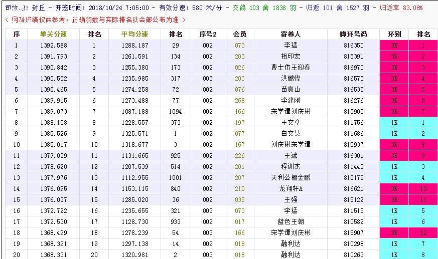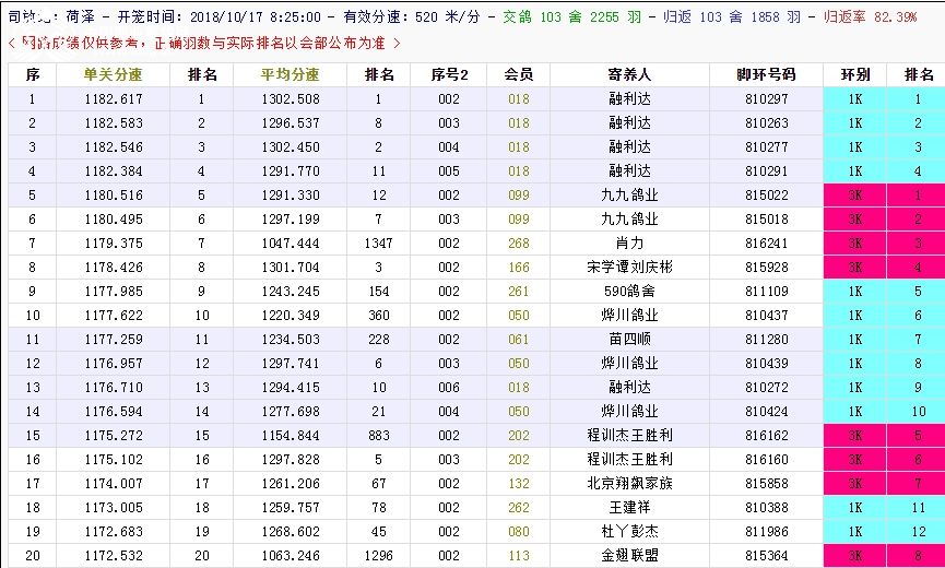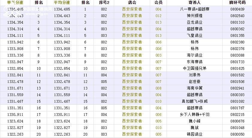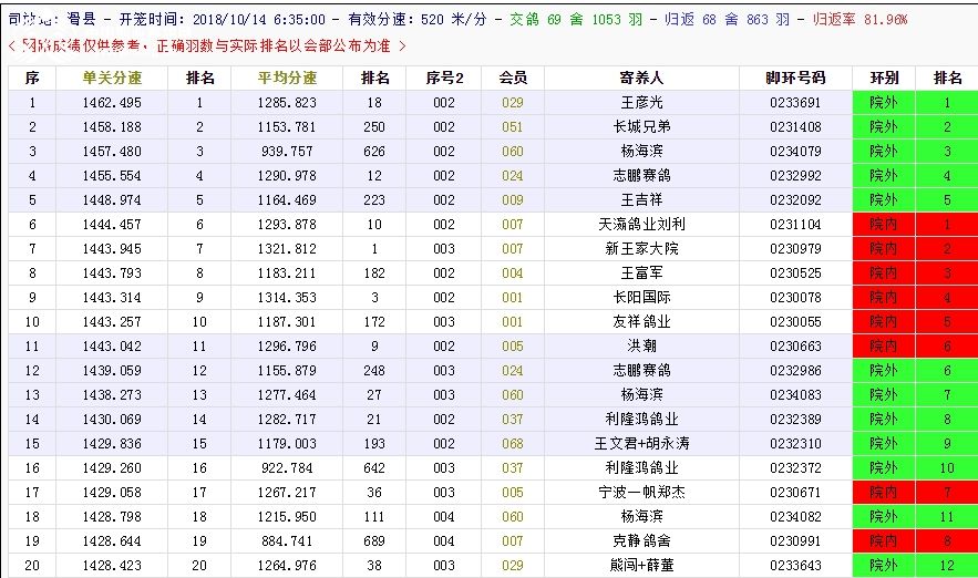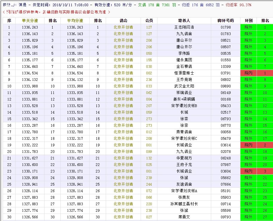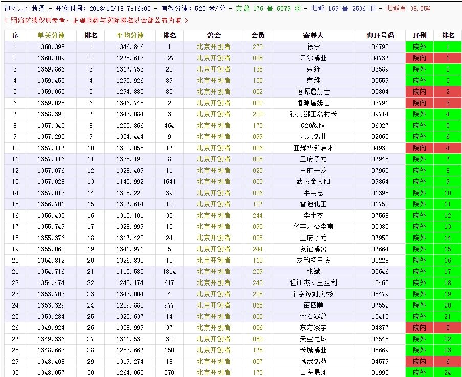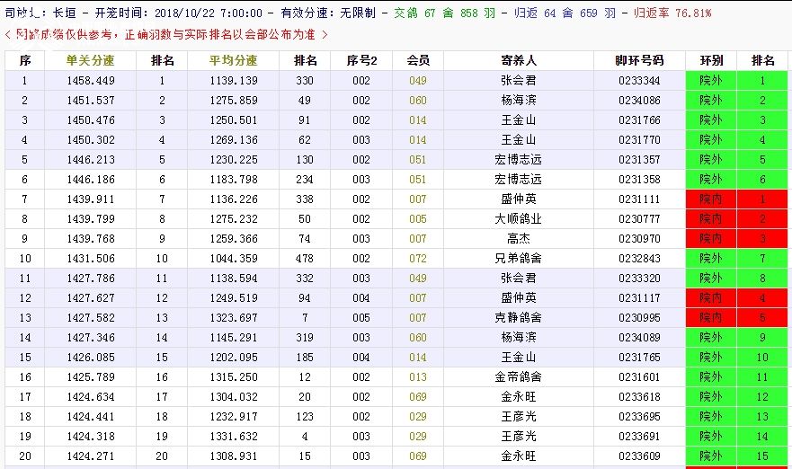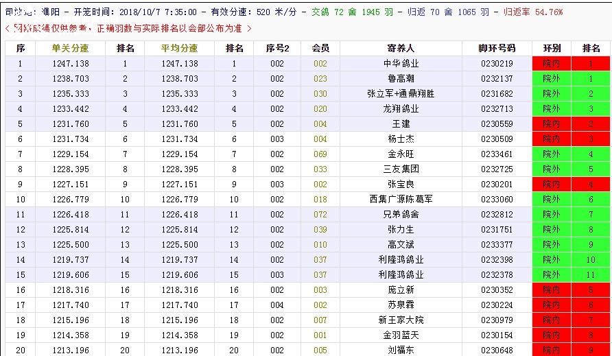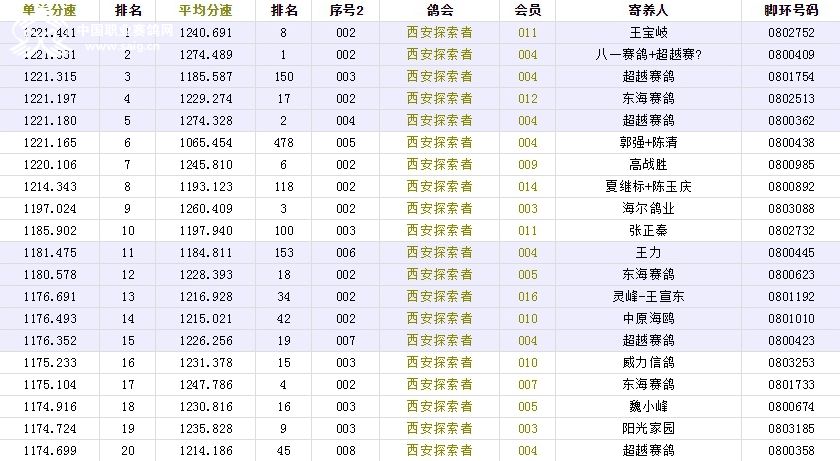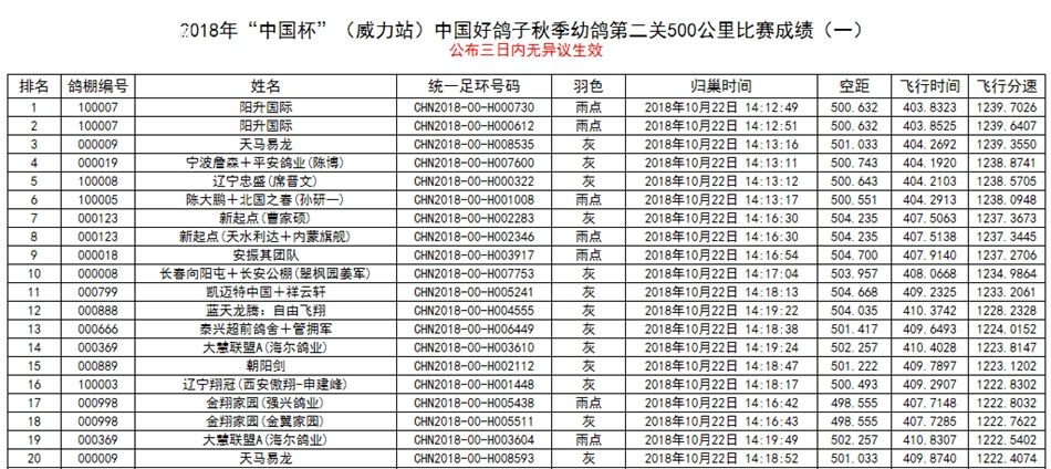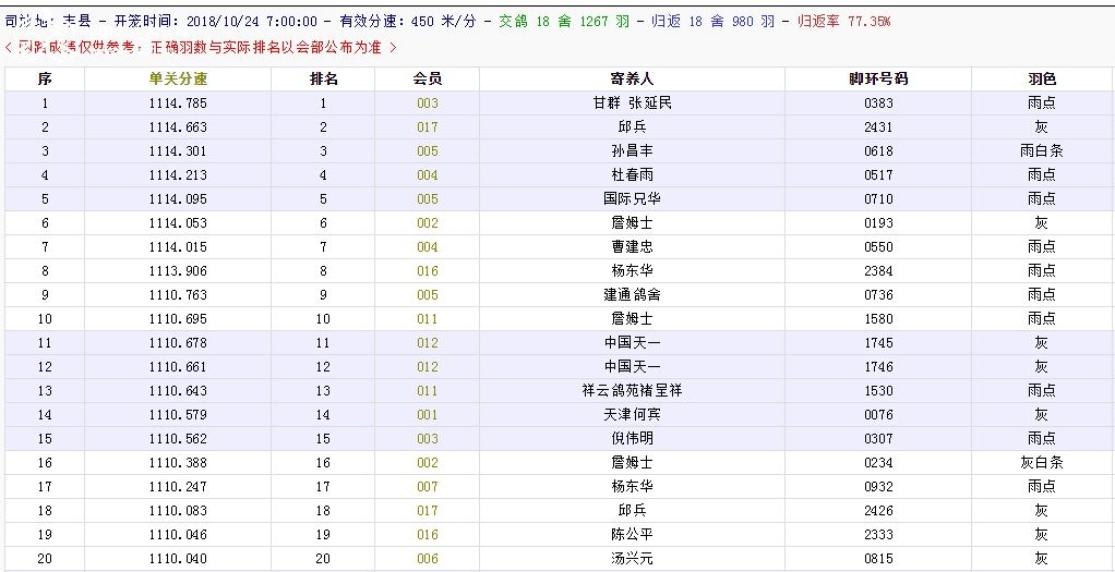 北京长阳国际赛鸽俱乐部四关鸽王挑战赛(前20名)